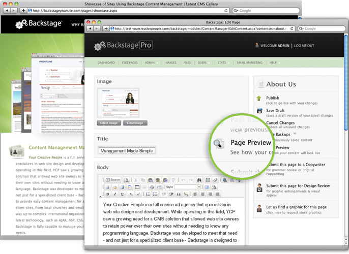 Backstage gives you the user-friendly simplicity of editing advanced features such as flash galleries, updating content and cropping photos all on your own with no training required. From the first 60-90 seconds you log in, the intuitive interface makes it simple for the first-time, non-code-minded user (such as an office administrative assistant) to update content without IT help.