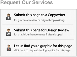 Let us help with professional copywriting & editing. Writer's block always comes at the last minute - and we've thought of that in developing the new Backstage. For those of you who are not professional copywriters or grammar experts, Backstage allows you to send your page to a professional for either a quick grammar tune-up or to take your existing text and give it some marketing appeal. This new service is affordable, quick-turn, and allows you to always view the changes before they go live.
