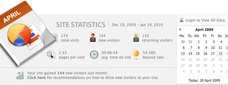 The Statistics Summary section on the Dashboard provides you with a snapshot of how your site is doing on a monthly, weekly, and daily basis; you can see detailed reports by clicking the 'login to view all data' link on the Dashboard. After logging in to Google Analytics, you will see reports on the visitors to your site, traffic sources, and content. Using these reports, you can increase your page rankings, track advertising campaigns, and increase the number of visitors to your site.